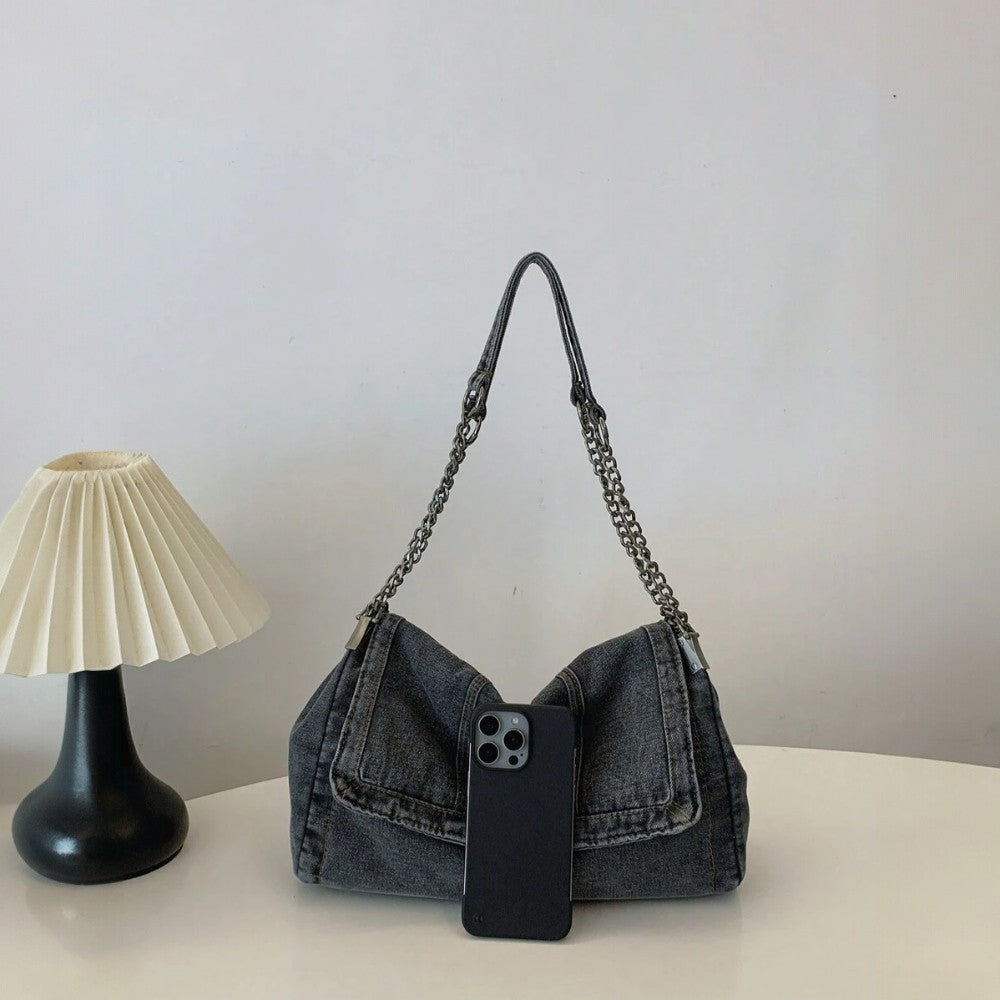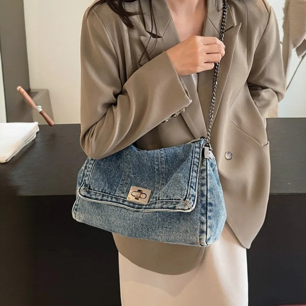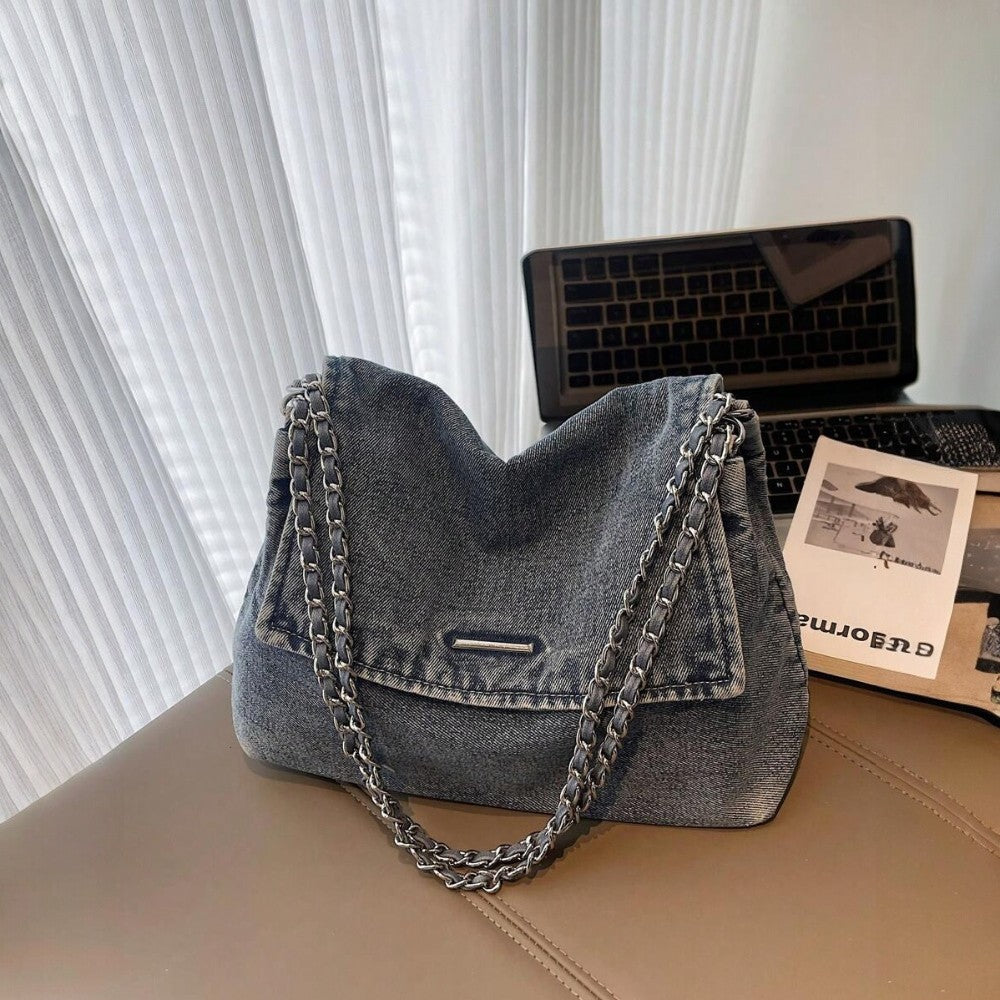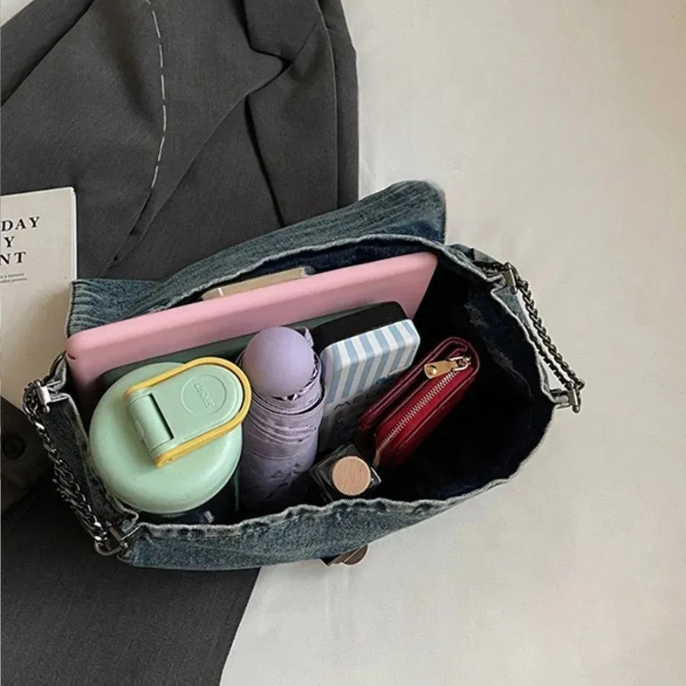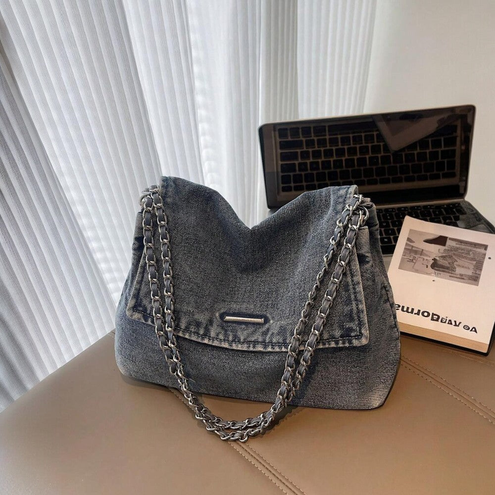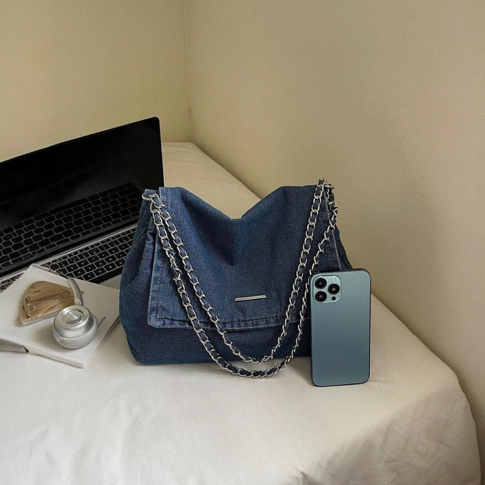 Vår Grace-veske er laget av høykvalitets denim, som kombinerer avslappet stil med holdbarhet. Den er designet for å være romslig nok, og rommer enkelt dine nødvendigheter: laptop, sminke og hverdagslige tilbehør.